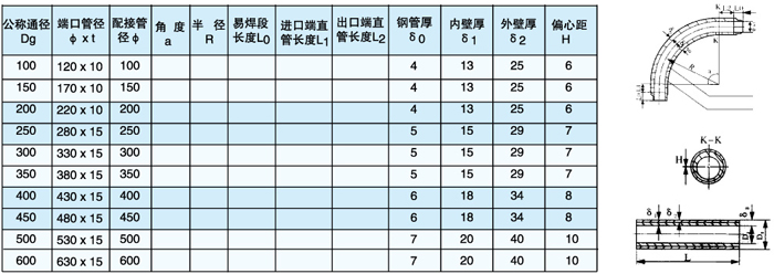 彎管尺寸及規格 ( 表中a、R、L0、L1、L2依設計要求確定 )
