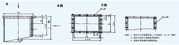 說明:1、表中尺寸和質量系按L=1100毫米、β=18°編制;2、圖中已包括上部聯(lián)接用緊固件;3、管體采用耐磨材料整體鑄造。
